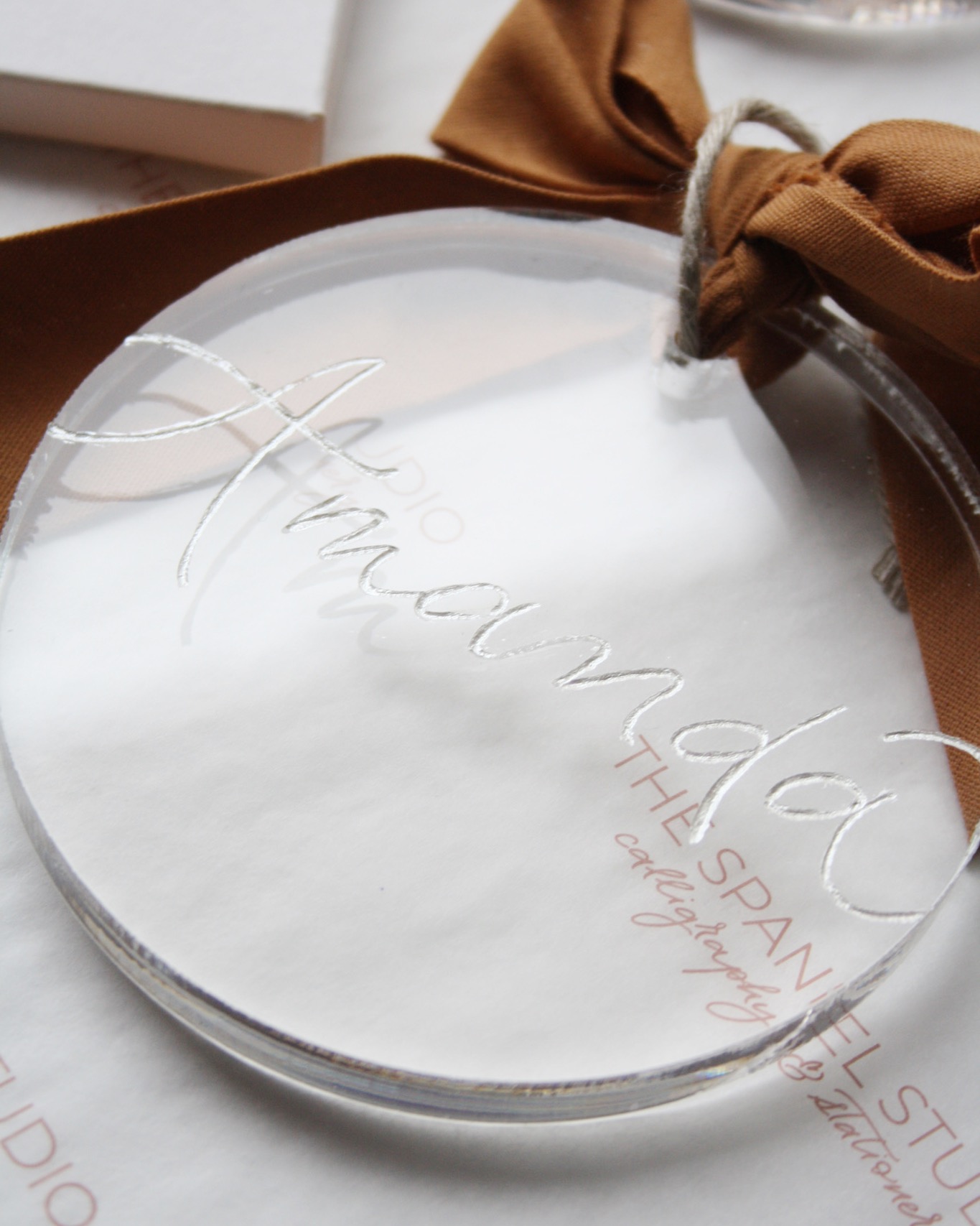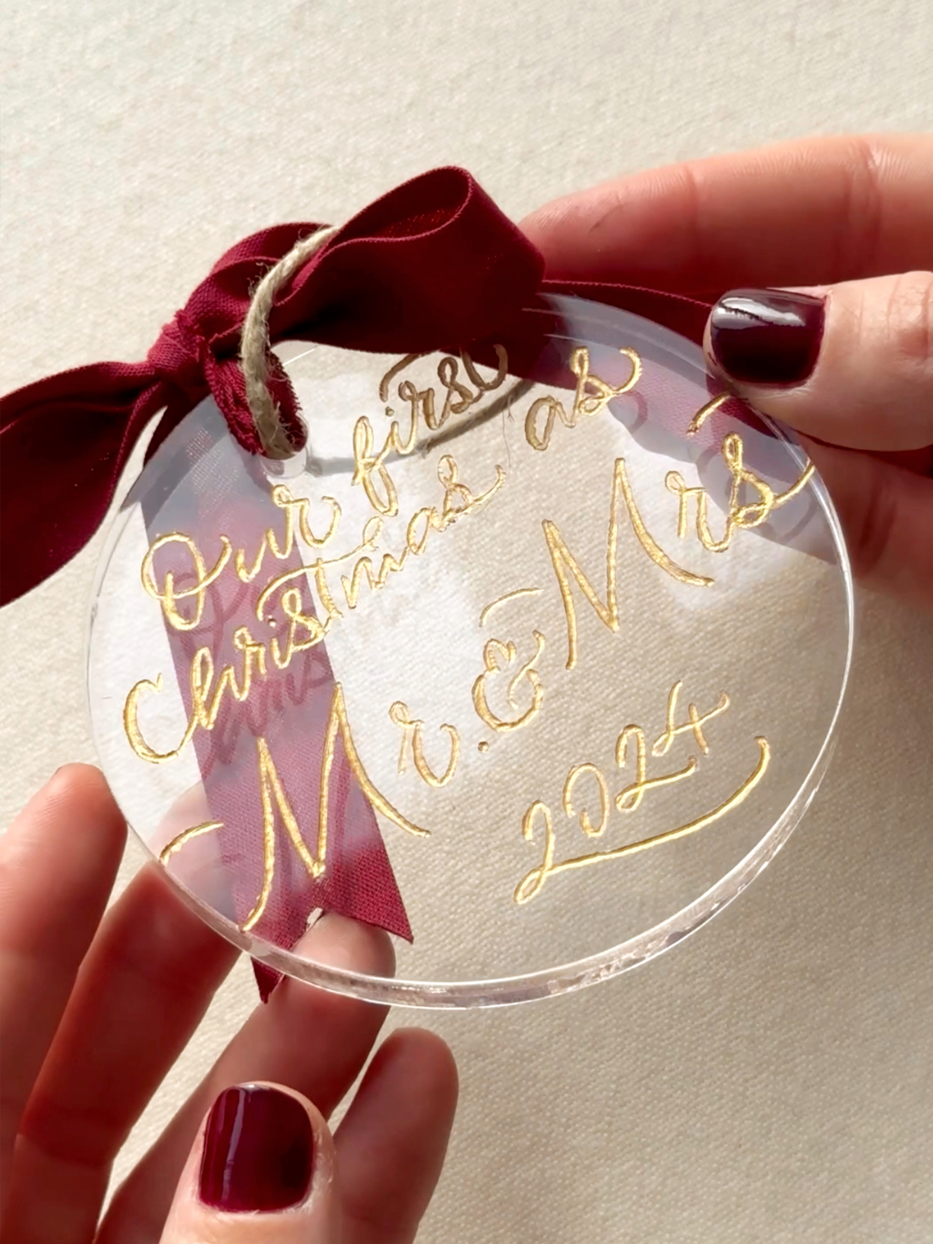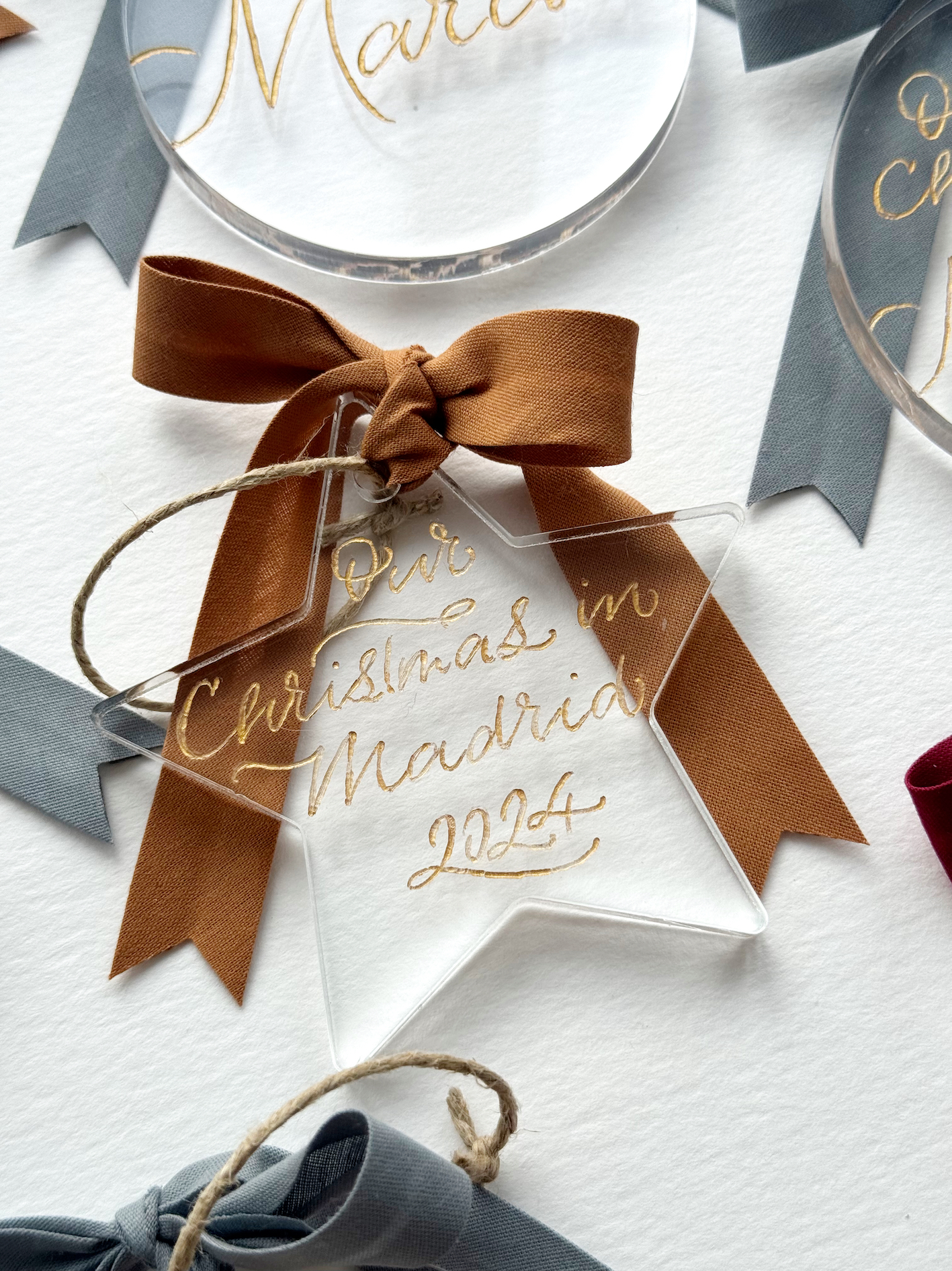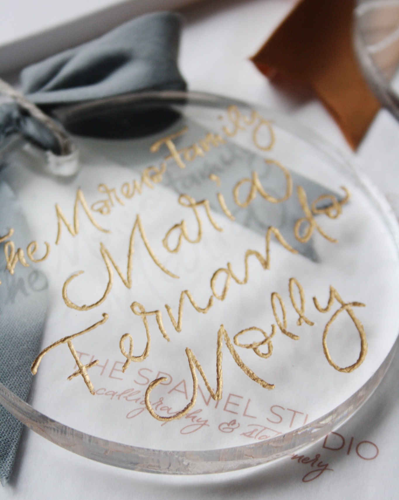 El adorno de Navidad hecho en exclusiva para ti (o para vosotros). Personalizaré vuestro adorno grabándolo con las palabras o frase que elijáis y añadiré un dorado o plateado final para que luzca como se merece en vuestro árbol de Navidad. Estros adornos de Navidad acrílicos tienen un diámetro de 9 cm y un grosor de 8 mm para que sean lo suficientemente resistentes para durar años. Porque ¿cómo vais a olvidar vuestra «primera Navidad en nuestro nuevo hogar», o vuestra «nuestra Navidad prometidos», o las «primeras Navidades» de vuestra hija? Yo ya tengo el de nuestra este año tan especial: nuestra primera Navidad en Pensacola ♥