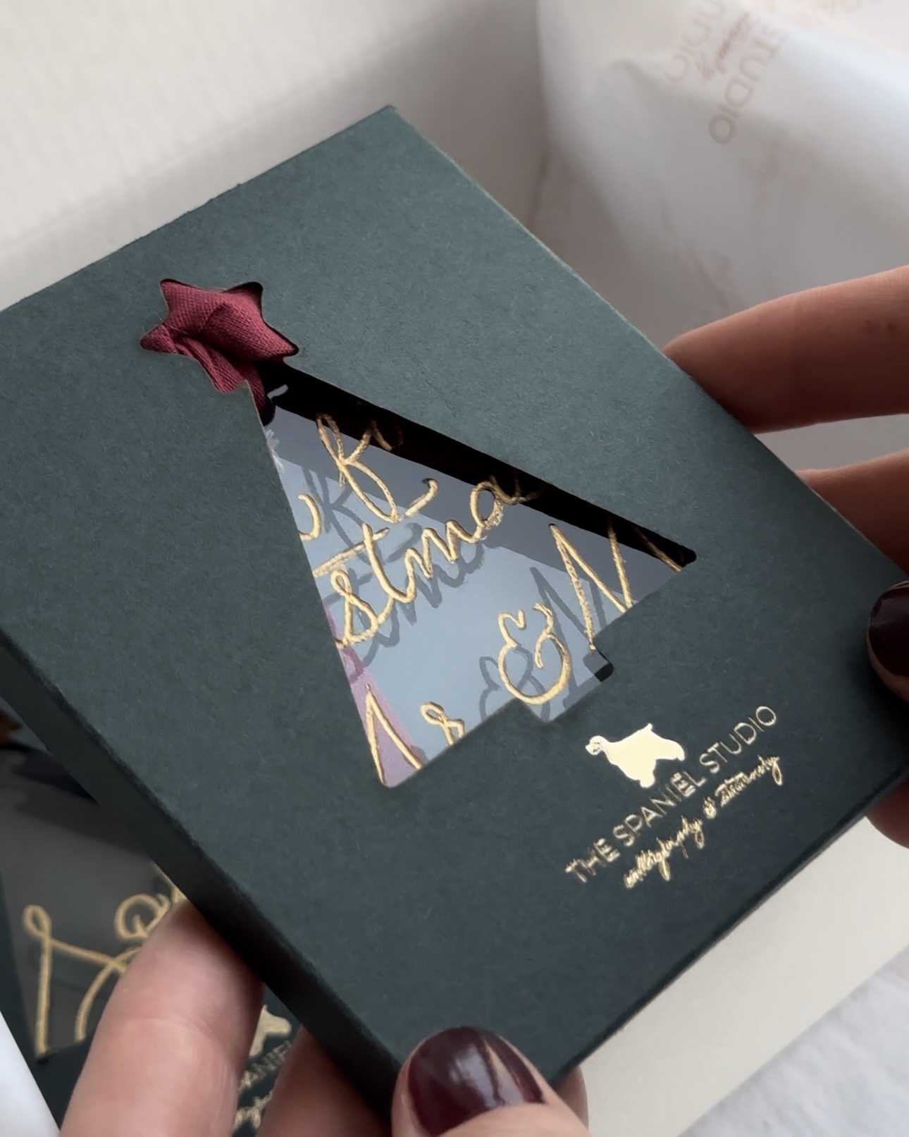 Te mandaré vuestro adorno con un bonito lazo de algodón (elige tu favorito entre una selección de tres colores que me encanta cómo quedan: azul grisáceo, burdeos o marrón tawny) y un cordón de yute natural para poder colgarlo directamente donde queráis. Elige la forma del adorno (circular o estrella) el acabado en dorado o plateado y el color del lazo que prefieras. Añade las palabras en el campo de notas, al hacer el pedido (está al final del proceso, tras introducir tus datos de envío/facturación. si tienes cualquier duda escríbeme a maria@thespanielstudio.com)