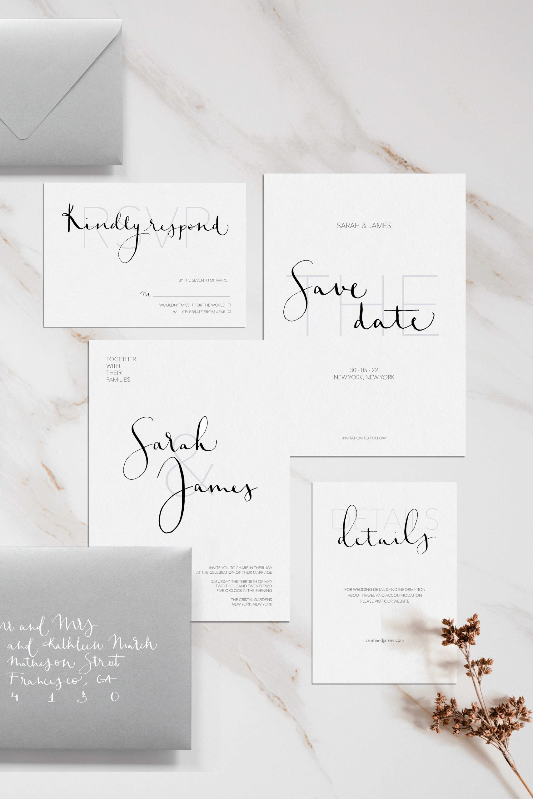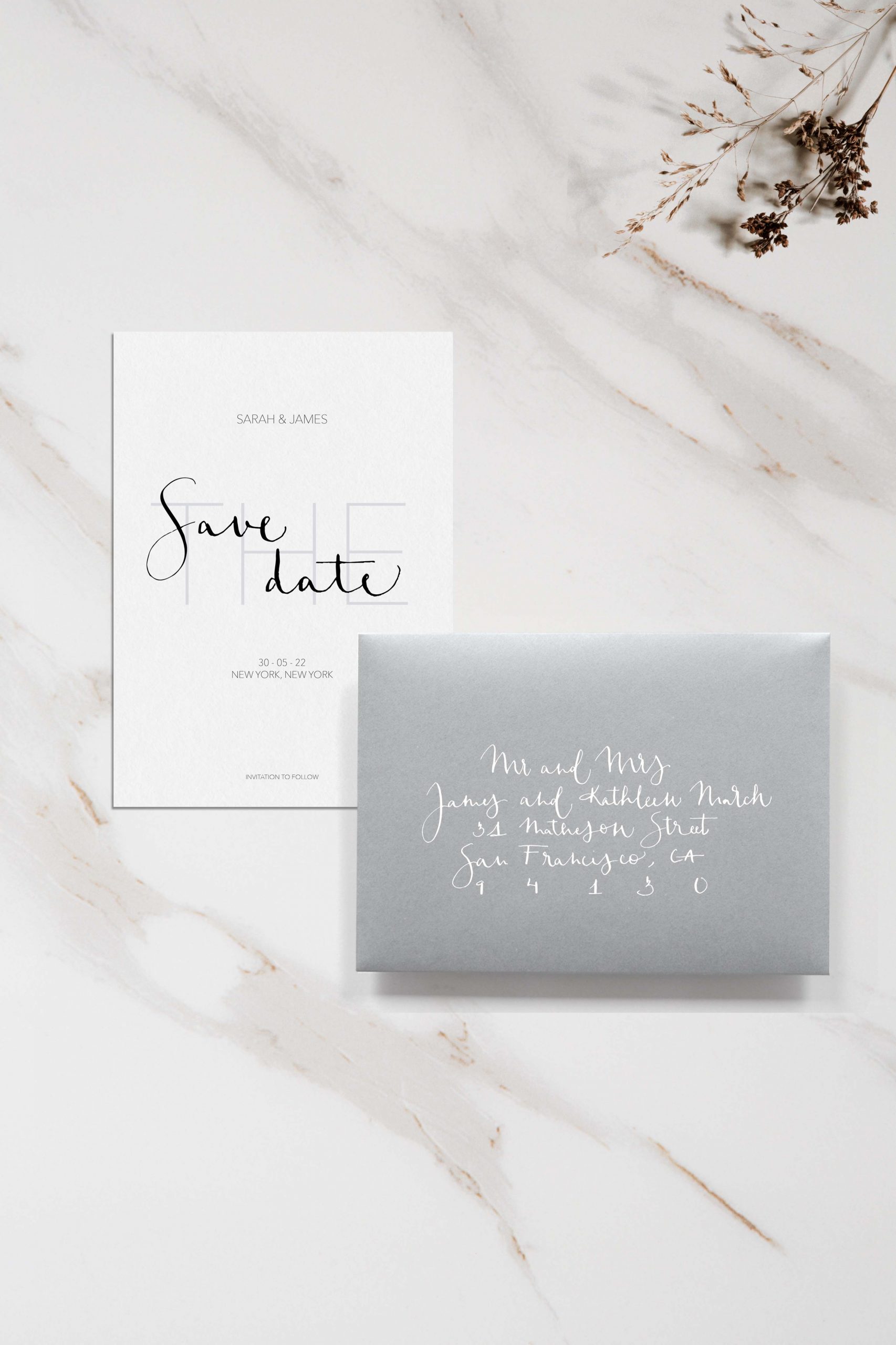 Elige entre el diseño gris y negro para un estilo más sobrio o el azul oscuro para un toque de color, así como otras opciones de producción (puedes elegir el tipo de papel, así como el método de impresión). ¿Quieres causar sensación entre tus invitados? valora el papel hecho a mano para esta colección, ¡queda increíble en él!