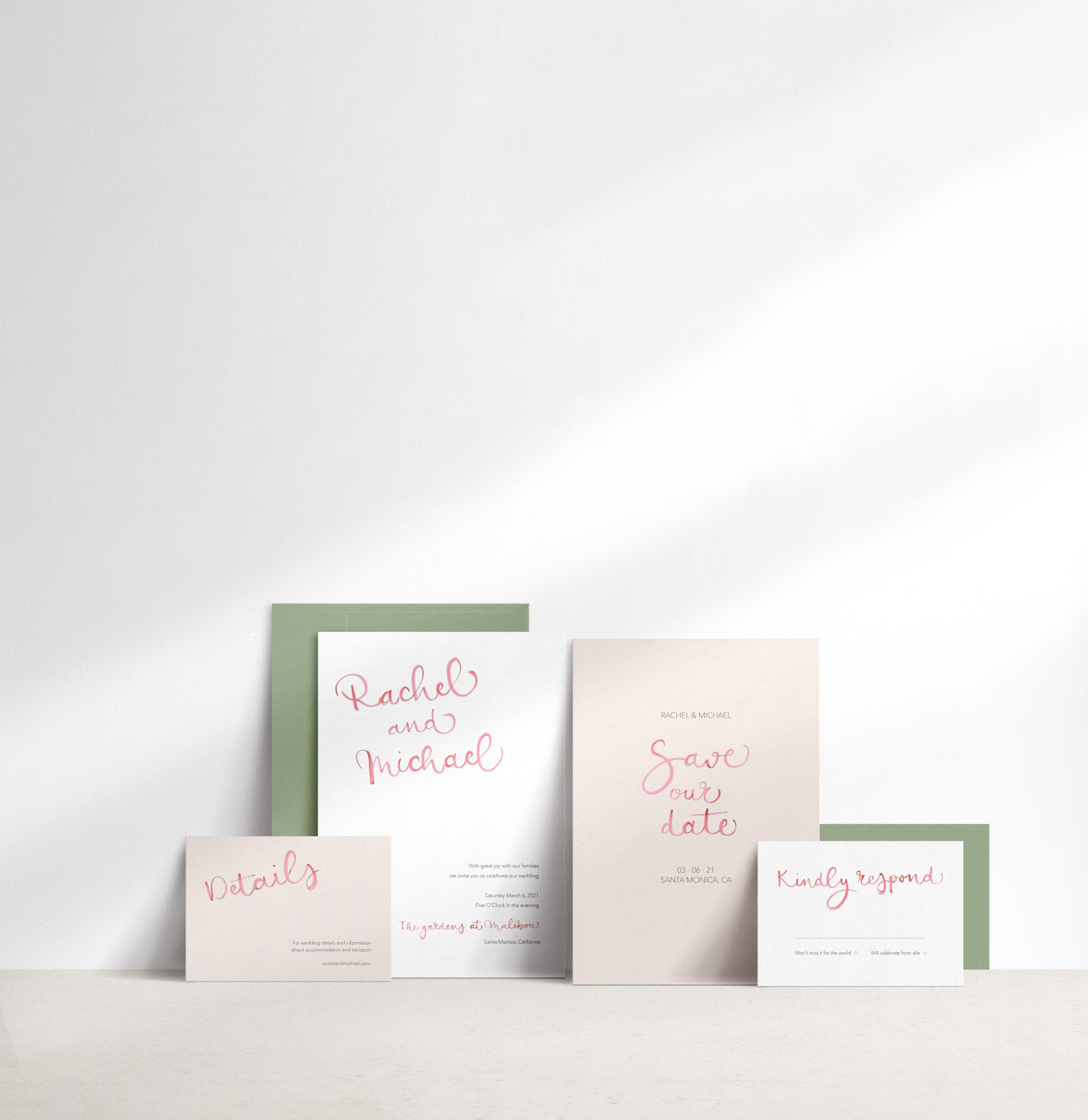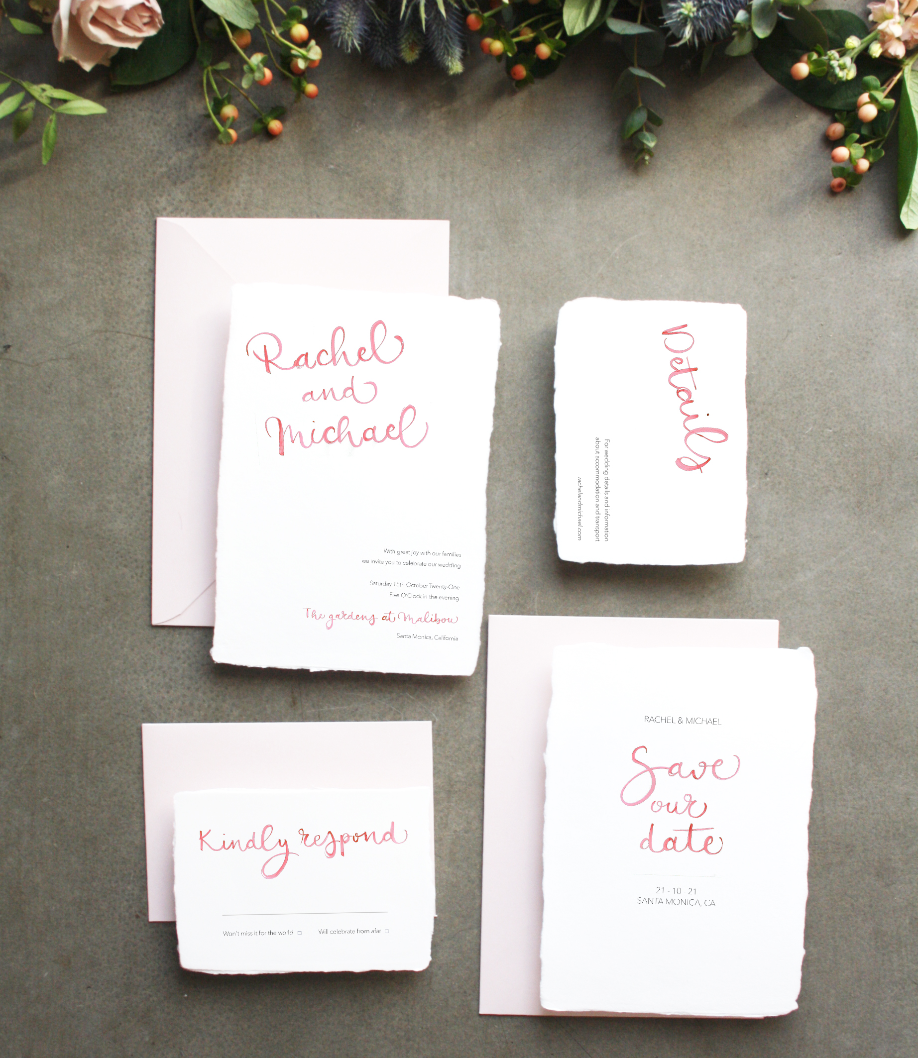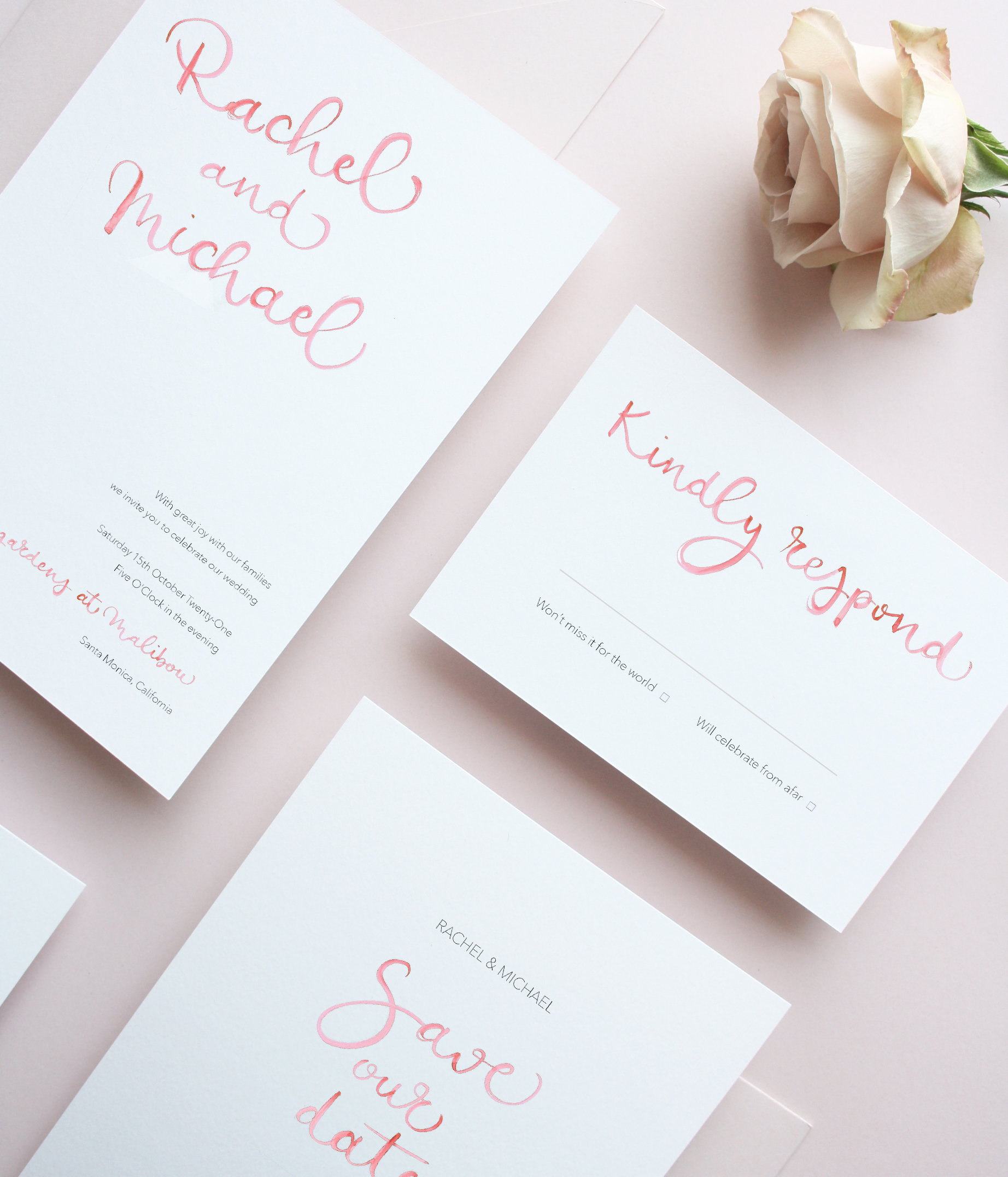 Un diseño original inspirado en la vibrante y distinguida Santa Monica, en la soleada California. Una colección minimalista y a la vez llena de energía, diseñada para aquellas parejas que saben que la suya será una boda única y buscan una papelería diferente. Elegid el color que más os guste para las letras y dejad el resto en mis manos: la caligrafía en acuarela queda increíble en este diseño!