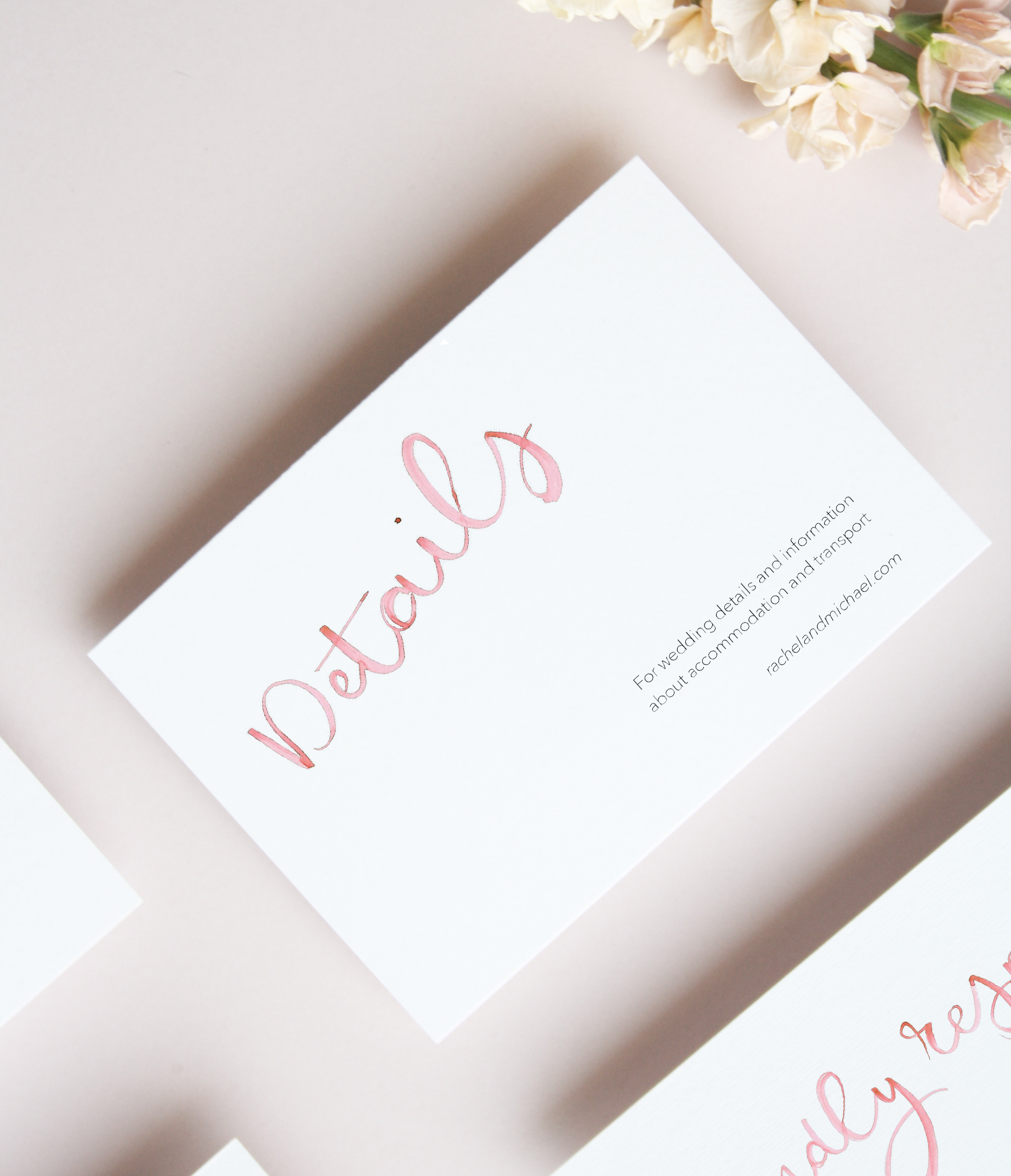 - En la Tarjeta de Detalles / más info (tamaño A6) podréis añadir información útil para vuestros invitados como la lista de boda, el transporte o la web de vuestra boda (procurad ser concisos, ¡recordad que vuestros invitados ya tienen a Google!).
