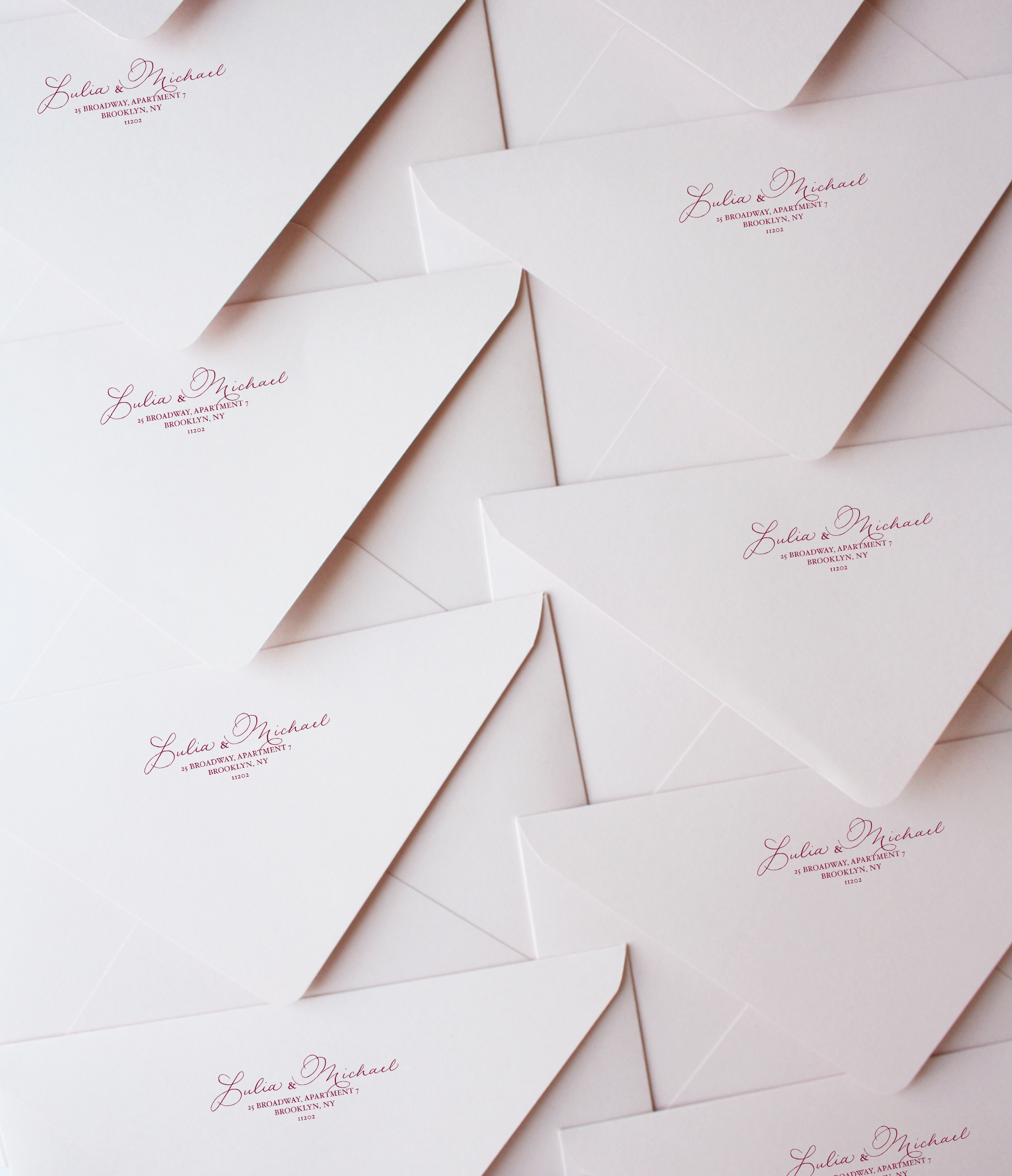 Deslumbra a tus invitados con estos sobres con caligrafía de tu elección (puedes elegir tanto el estilo de caligrafía como el color de la tinta). Caligrafiaré a mano cada sobre con los nombres y direcciones de tus invitados, para que tu invitación llegue del modo más exquisito.