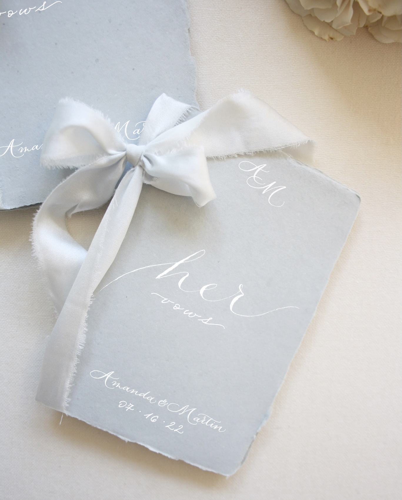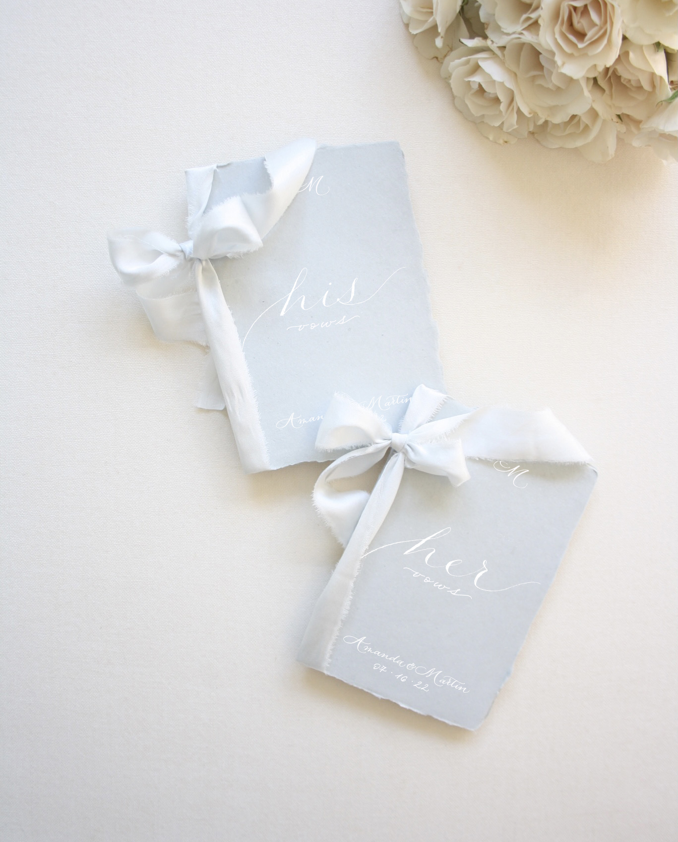 Exclusive and delicate his and her vow booklets, handwritten with calligraphy and customized with your initials, names and wedding date. The Cover Pages are made from soft, blue handmade paper 100% cotton, and a pretty snow color silk charmeuse ribbon is added to each of them. Every booklet contains 8 smooth finish sides for writing. The dimensions are 4.1″ x 5.8″ (approx., as the handmade paper has this characteristic deckled and irregular edges -that I love!). I’ll personally calligraphy your vows with white ink on the most exquisite muted blue tone handmade paper imported from Europe.