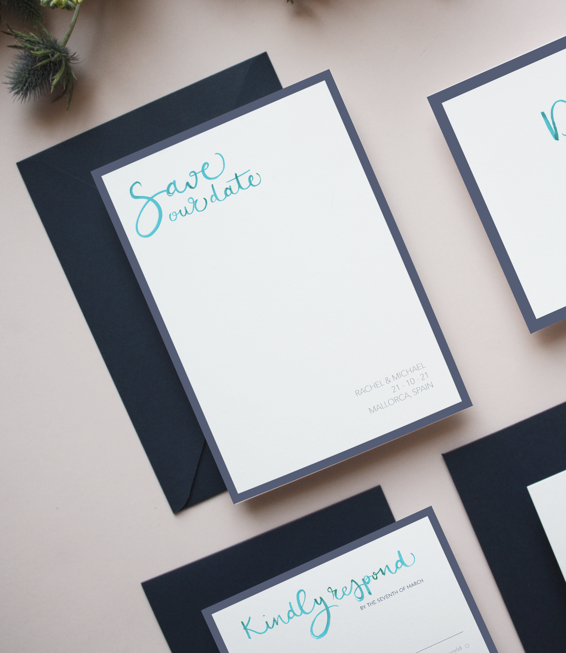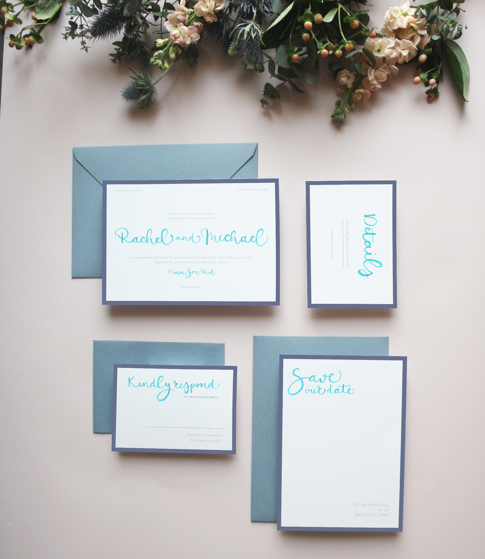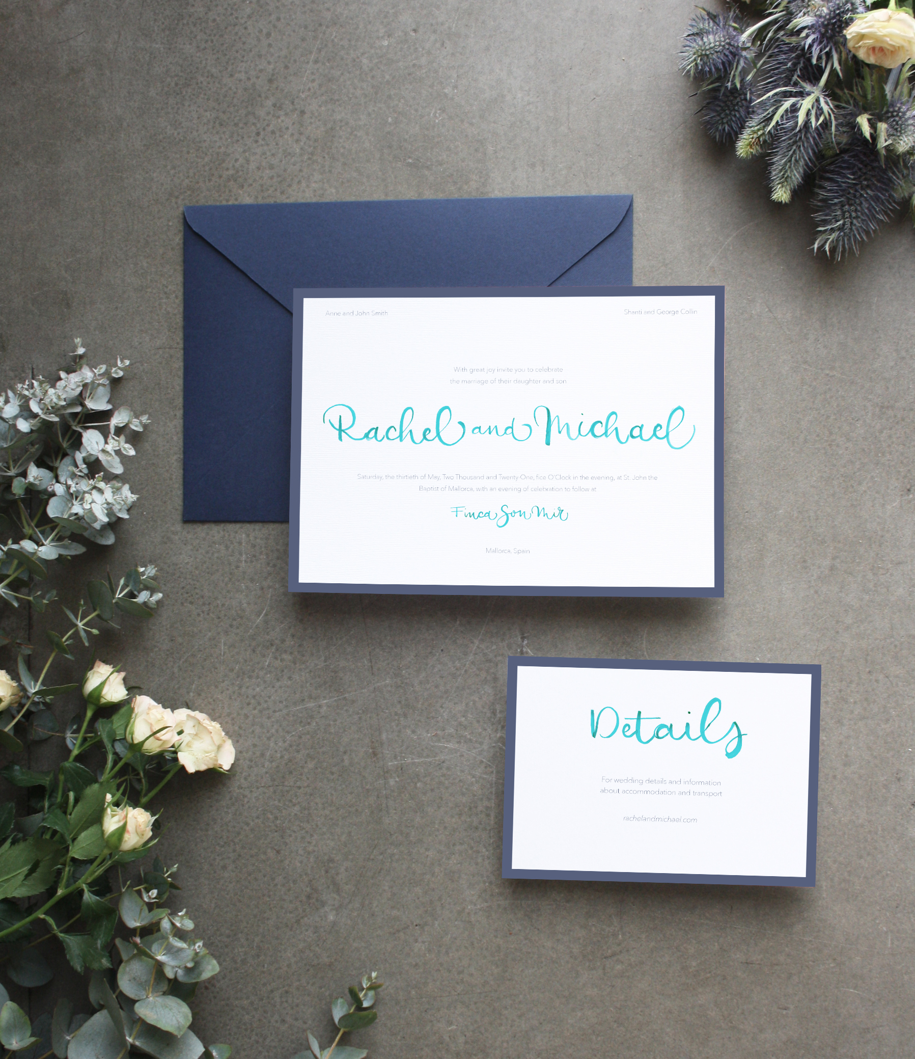 An original design inspired by the unique sea colors of the amazing Balearic Islands in Spain.  A collection designed for those couples that are looking for a sophisticated invitation to share the good news with friends and family and also want to keep a classic aesthetic. A unique wedding invitation with calligraphy customized for you.