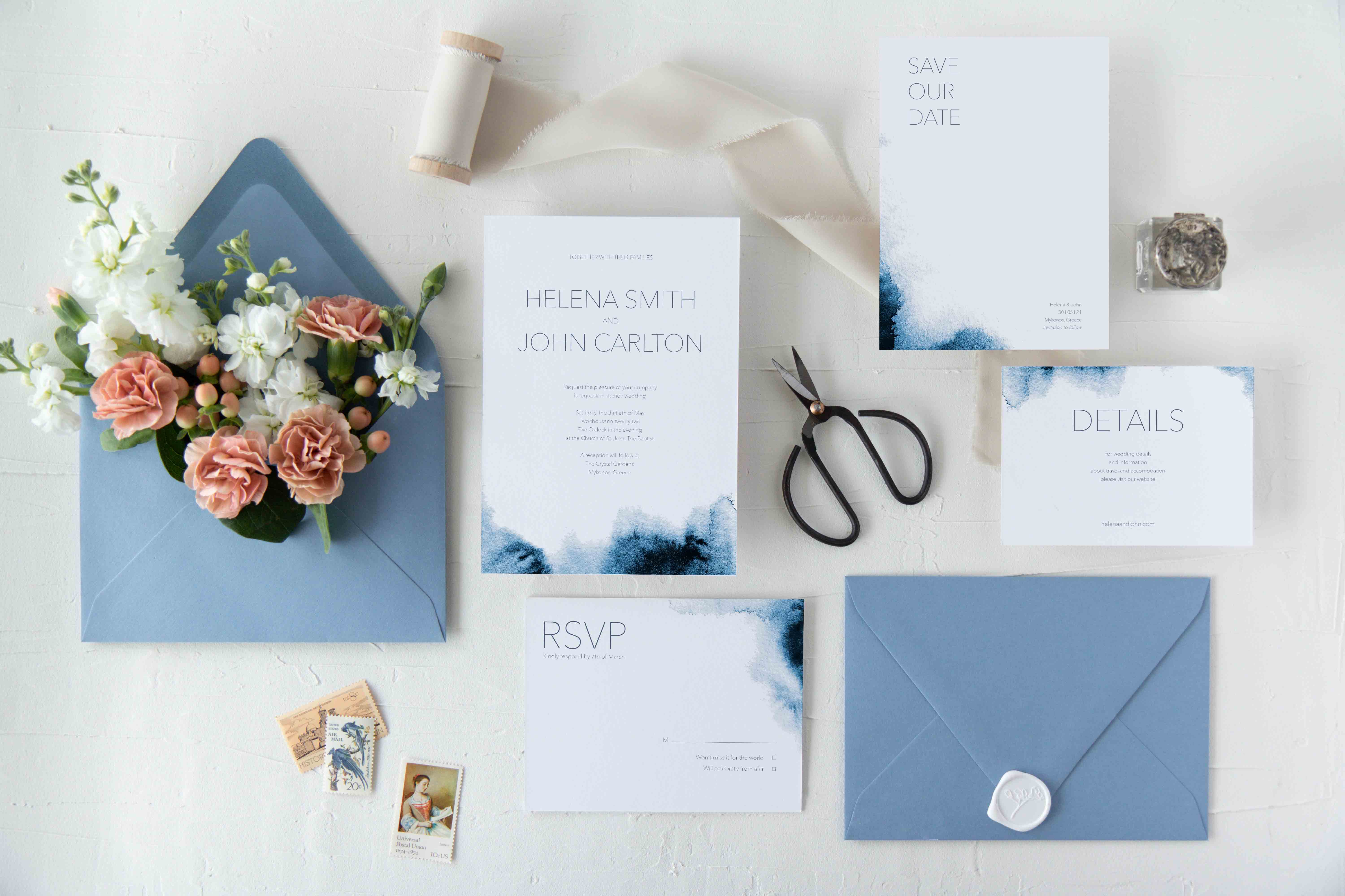 An original design inspired by the deep blues and pure whites of the amazing greek isle of Mykonos. A truly unique collection, designed to impress your guests from the very beginning. Specially conceived for those who are looking for a modern yet elegant design for their wedding. Its beautiful blue and shapes make this one a perfect fit for a wedding in a sea place.