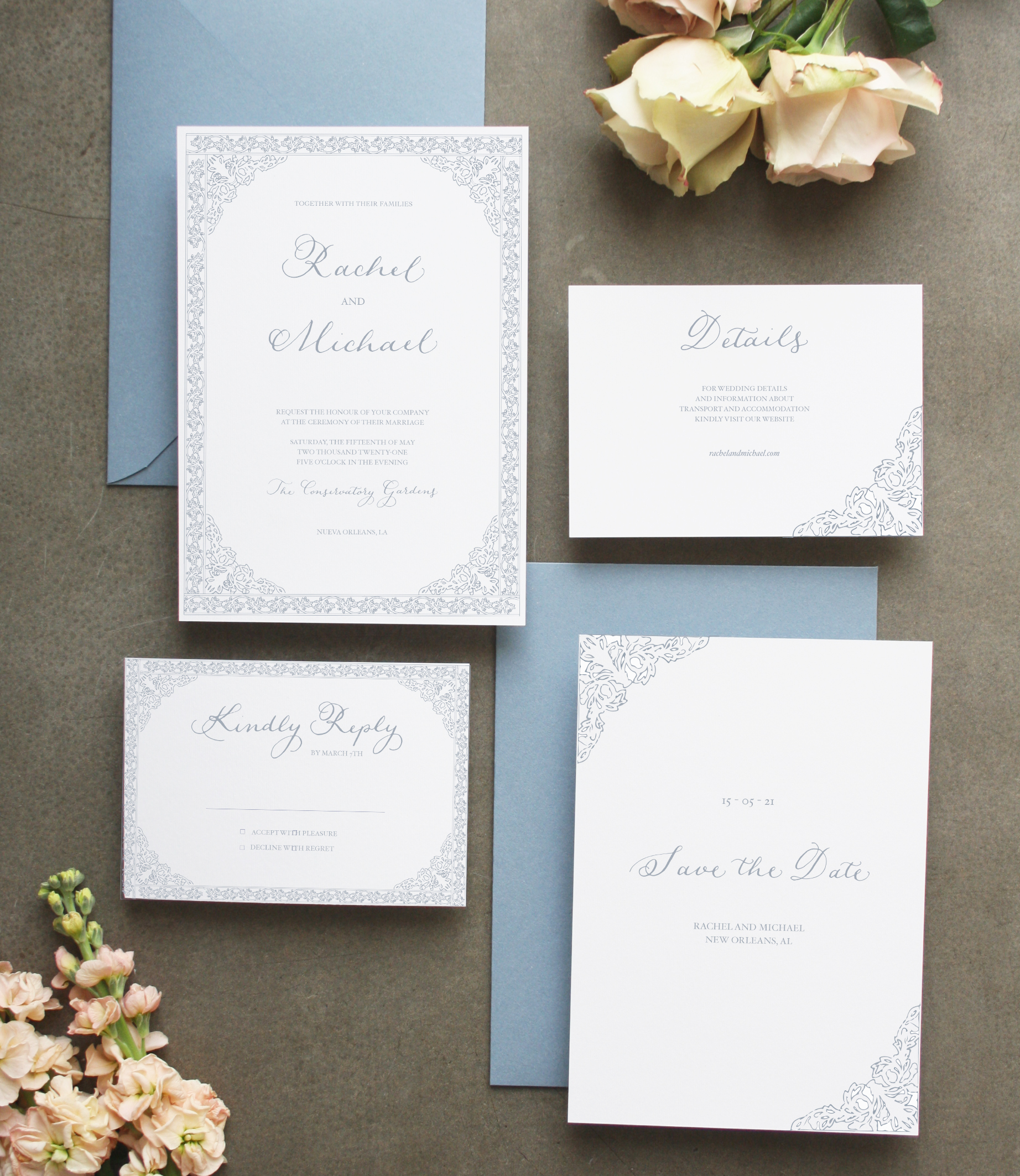 The New Orleans Suite color is designed in the most exquisite blue-grey; however it is also available in navy color for a further definition of its details; choose the color your prefer as well as other production options (you can choose the kind of paper as well as the print method). Want to really cause an impression? consider the handmade-paper, this New Orleans Collection looks amazing on it!